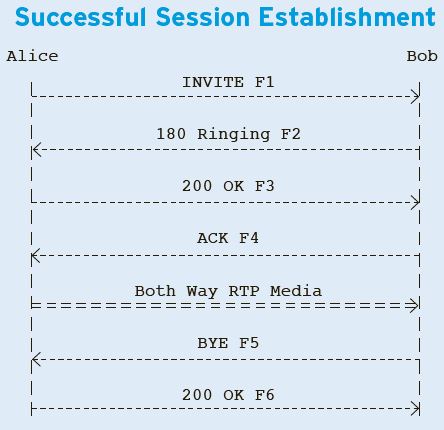A basic SIP call flow between two SIP devices is fairly straightforward and involves only a handful of messages that mimic the way a traditional call is made. These messages include the invitation (called a SIP INVITE), the generation of a ringing sound on the caller’s device, an acknowledgment (ACK) when the called SIP device answers, and the session termination (BYE). In between is the two-way passage of RTP media. A sample call flow between Alice and Bob, for example, would look like this:
